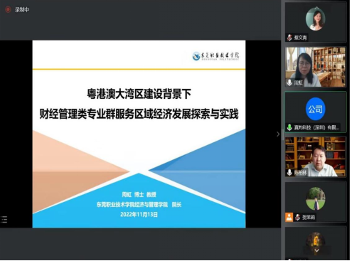 经济与管理学院院长周虹作了“粤港澳大湾区建设背景下财经管理类专业群服务区域经济发展探索与实践”的专题汇报,汇报主要围绕在粤港澳大湾区产教城深度融合的背景下,学院的办学成效及校企双元的培养模式,我校经济与管理学院财经专业群形成了一批高质量品牌社会服务项目,积极参与搭建东莞财政金融科技服务平台,开展财政与金融协同创新,助力地方经济社会发展。