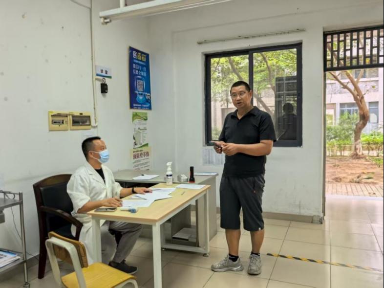 在演练过程中,模拟了学生感到不适并前往校医室求诊的场景。校医经过诊断,初步怀疑该学生患有基孔肯雅热,随即要求学生采取防护措施并进行临时隔离。同时,立即启动应急预案,逐级上报相关情况。院领导及后勤保卫办迅速到场了解情况,并向辖区疾控中心进行上报。随后,按照疾控中心的指示,跟进处理患者的隔离、环境消杀等后续工作。